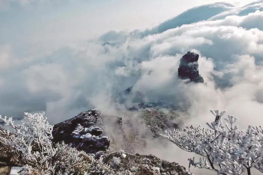 冬季东谈主潮褪去,梵净山显知道“太空之城”本真是灵性。海拔越高,冬意越浓。山间常覆盖着乳白色的霏霏,红云金顶在流动的云海中乍明乍灭,宛如悬空岛。若遇降温,树枝凝上雾凇,石阶覆上薄霜,整座山静谧如一幅水墨长卷。